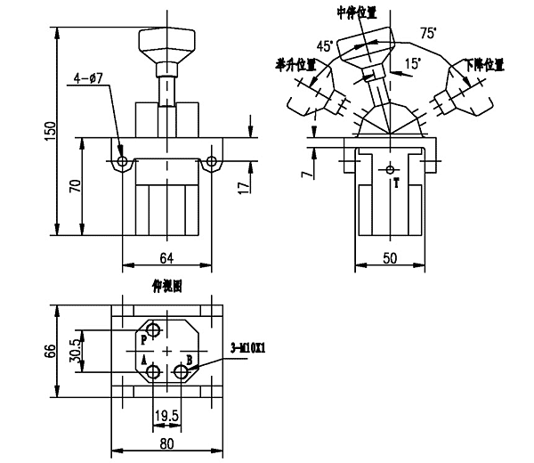 ¡¡¡¡®”(d¨¡ng)ÊÖ±úÔÚ¡°ÖÐÍ£¡±Î»ÖÕr(sh¨ª), P¿ÚêP(gu¨¡n)é], A¡¢B¿Ú²»¹¤×÷£»®”(d¨¡ng)ÊÖ±úÔÚ¡°ÅeÉý¡±Î»ÖÕr(sh¨ª),P¿ÚÅcA¿ÚÏàͨ,B¿Ú²»¹¤×÷£»®”(d¨¡ng)ÊÖ±úÔÚ¡°Ï½µ¡±Î»ÖÕr(sh¨ª)£¬P¿ÚÅcB¿ÚÏàͨ£¬P¿ÚÅcA¿ÚÏàͨ,A¿Ú²»¹¤×÷¡£