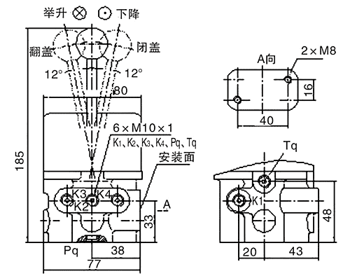 用途與特征: 4KQF型操縱氣閥是一種整體式多路氣控操縱氣閥。搬動手柄可在四個個不同角度分別控制多路閥工作。具有其重量輕,體積小,對環(huán)境無污染, 靈敏度高得多等優(yōu)點(diǎn)。是5噸位以上自卸汽車氣路控制的一種理想元件。 4KQF型操縱氣閥的原始位置Pq口與T口是封閉的,各控制口K與Tq口相通。搬動手柄可在四個不同角度。