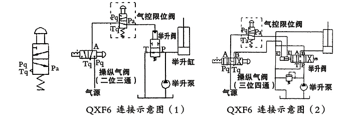 用途與特征: QXF6型氣控限位閥是二位三通型的氣動(dòng)元件,以壓縮空氣為工作介質(zhì),在各種自卸車的控制氣路中它與舉升閥的控制氣缸管路串接在一起使用,是自卸車舉升至極限位置時(shí)起限位作用控制閥。 QXF6型氣控限位閥的原始位置Pq口與Pa口是連通的(常開式結(jié)構(gòu))。在連接示意圖(1)中搬動(dòng)操縱氣閥的手柄換向至工作位置(Pq口與A口連通)將壓縮空氣經(jīng)氣控限位閥進(jìn)入舉升閥氣缸使舉升閥換向?qū)崿F(xiàn)液壓缸上升。當(dāng)車廂舉升到最大轉(zhuǎn)角位置時(shí),限位機(jī)構(gòu)將氣控限位閥的限位桿壓下切斷其進(jìn)氣口(Pq口與Pa口是斷開),Pa口與Tq口接通使舉升閥氣缸內(nèi)的壓縮空氣由氣控限位閥排入大氣。這時(shí)舉升閥P口與T口瞬間連通,舉升缸即下降一段距離(車廂舉升轉(zhuǎn)角變小),隨車廂舉升轉(zhuǎn)角變小氣控限位閥的限位桿恢復(fù)原始狀態(tài)同時(shí)壓縮空氣經(jīng)該閥再次進(jìn)入舉升閥氣缸使舉升缸,上升(車廂再次舉升到最大轉(zhuǎn)角位置)。 在氣控限位閥的限位桿行程范圍內(nèi)(即Pa口的閉合開啟閉合)實(shí)現(xiàn)車廂下降舉升下降往復(fù)變化過程,使車廂產(chǎn)生輕微抖動(dòng)有利于將車廂內(nèi)的殘留物體卸掉。在連接示意圖(2)中搬動(dòng)操縱氣閥的手柄換向至工作位置(Pq口與A口連通)將壓縮空氣經(jīng)氣控限位閥進(jìn)入舉升閥的氣缸K1口實(shí)現(xiàn)液壓缸上升。當(dāng)車廂舉升到最大轉(zhuǎn)角位置時(shí),限位機(jī)構(gòu)將氣控限位閥的限位桿壓下切斷其進(jìn)氣口(Pq口與Pa口是斷開),Pa口與Tq口接通使舉升閥氣缸內(nèi)的壓縮空氣由氣控限位閥排入大氣。這時(shí)舉升閥回到中位,P口經(jīng)B口與T口連通回油,A口關(guān)閉車廂處于最高舉升位置狀態(tài)。