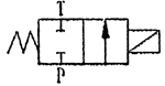 當車廂舉升到最大轉(zhuǎn)角位置時,限位機構(gòu)觸點將電器行程開關(guān)的觸點壓下,電磁鐵N得電,換向閥P口與T口接通,使舉升缸供油口與T口瞬間連通,舉升缸即下降一段距離(車廂舉升轉(zhuǎn)角變小),隨車廂舉升轉(zhuǎn)角變小限位機構(gòu)觸點離開電器行程開關(guān)的觸點使電磁鐵N失電,電磁換向閥恢復(fù)原始狀態(tài)同時系統(tǒng)壓力油再次進入舉升缸使其上升(車廂再次舉升到最大轉(zhuǎn)角位置)。電磁鐵N在電器行程開關(guān)得電—失電—得電范圍內(nèi)(即P口的開啟—閉合—開啟)實現(xiàn)車廂下降—舉升—下降往復(fù)變化過程,使車廂產(chǎn)生輕微抖動有利于將車廂內(nèi)的殘留物體卸掉。該閥的工作原理示意圖如下。