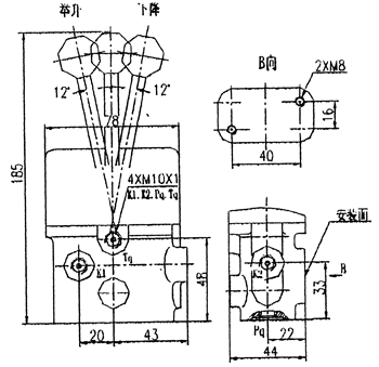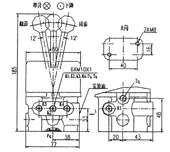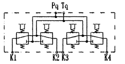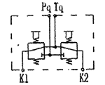 4(2)KQF型操縱氣閥的原始位置Pq口與T口是封閉的,各控制口K與TQ口相通。搬動手柄可在四個或二個不同角度。該閥的工作原理示意圖如下